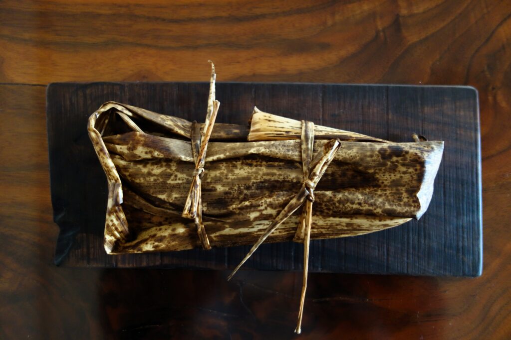 竹の皮に敷き、形を作ります。