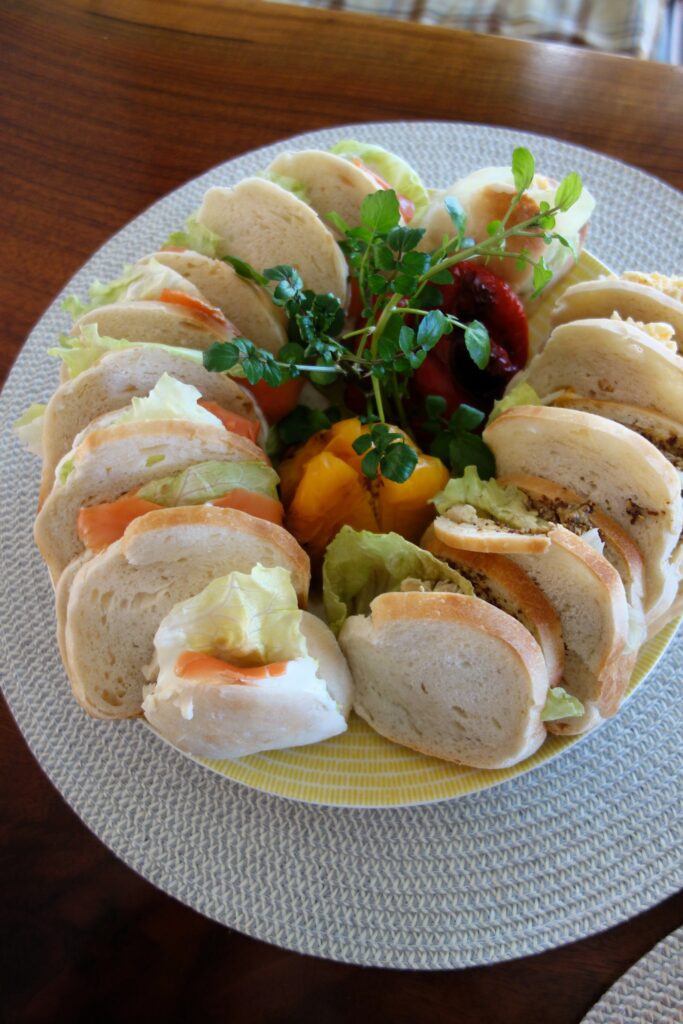 ・サンドイッチ(手作り酵母パン、サーモン、クリームチーズ、マグロ、塩、コショウ、豆乳マヨネーズ、マスタード、卵)